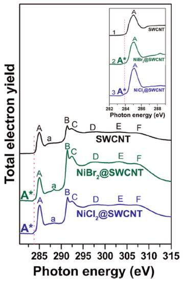- Kharlamova, M.V.; Yashina, L.; Eliseev, A.; Volykhov, A.; Neudachina, V.S.; Brzhezinskaya, M.; Zyubina, T.S.; Lukashin, A.V.; Tretyakov, Y.D. Single-walled carbon nanotubes filled with nickel halogenides: Atomic structure and doping effect. Phys. Status Solidi (B) 2012, 249, 2328–2332. [Google Scholar] [CrossRef]