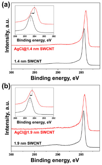 - Kharlamova, M.V.; Kramberger, C.; Domanov, O.; Mittelberger, A.; Yanagi, K.; Pichler, T.; Eder, D. Fermi level engineering of metallicity-sorted metallic single-walled carbon nanotubes by encapsulation of few-atom-thick crystals of silver chloride. J. Mater. Sci. 2018, 53, 13018–13029. [Google Scholar] [CrossRef]