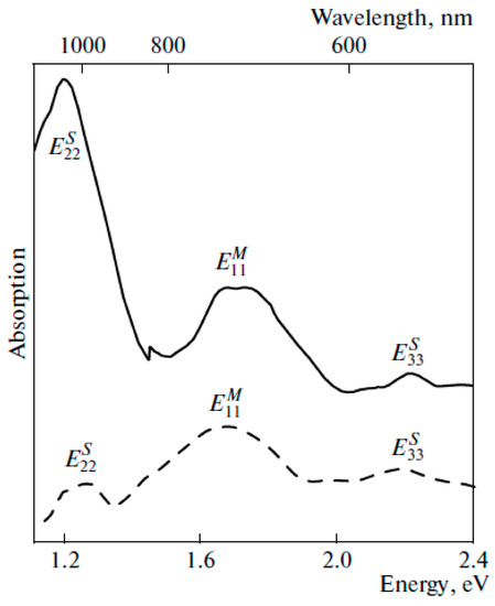 - Kharlamova, M.V. Advances in tailoring the electronic properties of single-walled carbon nanotubes. Prog. Mater. Sci. 2016, 77, 125–211. [Google Scholar] [CrossRef]
