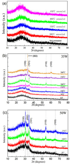 (a) XRD patterns of the samples without annealing or annealed at 300−450 °C; (b) XRD patterns of the samples deposited at 35 W and under different substrate temperatures; (c) XRD patterns of the samples deposited at 50 W and under different substrate temperatures.