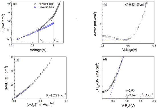 where JL is the light-induced current (JL = JSC = 1.74 mA/cm2 here), while the other parameters have the same meaning as previously defined. Figure 9b shows the dJ/dV vs. V curve, and the shunt conductance G is found to be 0.43 mS/cm2 from the nearly flat area in the reverse bias. The dV/dJ vs. [J + JSC]−1 curve is presented in Figure 9c, and the series resistance Rs is calculated to be 1.26 Ω·cm2. From the J + JSC − GV vs. V − RsJ curve in Figure 9d, the diode current J0 and the ideality factor η are calculated to be 7.76 × 10−2 mA/cm2 and 2.90, respectively. The ideality factor η larger than two implies that the current transport is recombination-limited [45]. To improve the conversion efficiency, the series resistance needs to be reduced and the shunt resistance needs to be improved. The possible methods include better ohmic contact, optimum film thickness, etc. The band gap needs to be reduced to improve the short-circuit current density Jsc. The theoretical open-circuit voltage Voc of the solar cell is estimated to be 0.24 V since Voc approximately equal if the series resistance and shunt resistance are negligible and the photogenerated current equals the short-circuit current density Jsc. The diode current J0 needs to be reduced to further improve the open-circuit voltage Voc.
