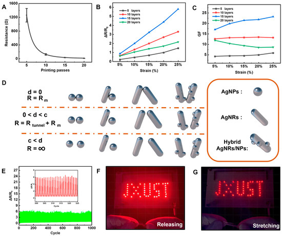Sensing performance and mechanism investigation. (A) Variation in resistance of the 3D networks-based sensor as a function of printing passes. (B) Relative resistance changes of the sensors with different printing layers under stretching. (C) GF changes of the sensors with different printing layers under stretching. (D) The model of different electrical interconnections between AgNRs and AgNPs. (E) Cyclic stretching and releasing tests of the sensors. (F,G) Bright variation in brightness of the connected LEDs under releasing and stretching states.