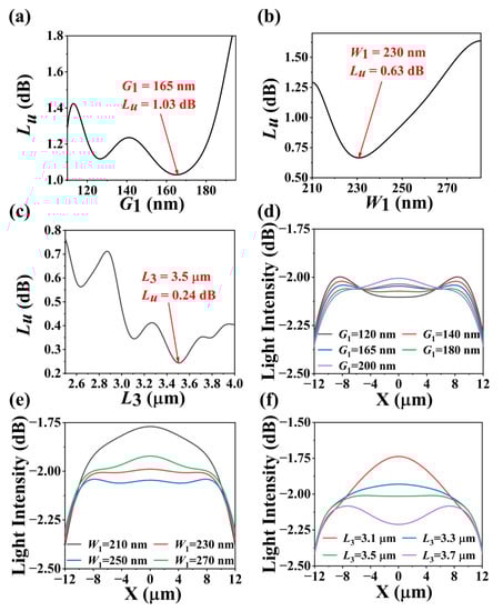 In order to simulate the performance of the nanowire-assisted high uniform AWG, 2.5D-FDTD (Lumerical FDTD Solutions of 8.9.1584) method was used []. Perfectly matched layers (PML) were used to simulate boundary conditions. The mesh size of the simulation area was set to ∆x = ∆y = 50 nm and ∆z = 20 nm. The refractive indices were 1.444 and 3.476 for SiO2 and Si, respectively. When the wavelength was 1556 nm, the dispersion was about 1.4227 × 103 ps/nm/km. The light source was set to TE mode with a center wavelength of 1556 nm. Additionally, the simulation areas of the 8 or 16-channel AWG were 310 × 290 or 450 × 350 μm2. Light intensity field distribution along the image plane of AWG with different values of G1, W1 and L3 were compared with the other two parameters unchanged as in Figure 2d–f. As shown in Figure 2d, it turns out that the ripple of light intensity distribution became the flattest at a G1 of 165 nm (blue line), while Figure 2e clearly shows that the flattest light intensity could be obtained at a W1 of 230 nm (red line). Additionally, Figure 2f indicates how the light intensity distribution was affected by nanowire length L3 and the flattest light intensity could be obtained at a L3 of 3.5 μm (green line).