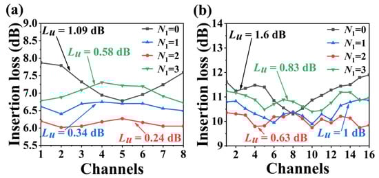 Simulated non-uniformity and insertion loss for all output channels of (a) 8 and (b) 16-channel nanowire-assisted AWG with the variation of N1.