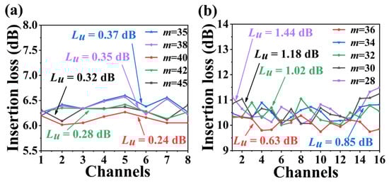 It is important to investigate the influence of diffraction order (m) on non-uniformity and insertion loss. Figure 4 demonstrates the non-uniformity and insertion loss of all output channels with change of diffraction order. The non-uniformity for an 8-channel AWG initially decreases and then increases when the diffraction order increases gradually from 35 to 45, as shown in Figure 4a. When m is 40, the non-uniformity can be minimized to 0.24 dB. For a 16-channel AWG, the non-uniformity gradually reduces as the diffraction order increases from 28 to 36 as in Figure 4b. The free spectral range of 25.99 nm in this AWG can be fully utilized at m = 36, and the minimum non-uniformity may be achieved at 0.63 dB.