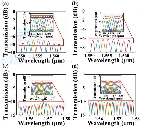 Figure 6 shows the spectral response of the 8- and 16-channel AWGs with the conventional and the nanowire-assisted design, respectively. The double nanowires with G1 = 165 nm, W1 = 230 nm and L3 = 3.5 μm can be chosen as the best parameters for subsequent simulations. For the 8-channel AWG as in Figure 6a,b, the non-uniformity is reduced from 1.09 to 0.24 dB as the insertion loss of the center channel is reduced from 6.78 to 6.26 dB. Meanwhile, the non-uniformity of the 16-channel AWG is reduced from 1.6 to 0.63 dB and the insertion loss of the center channel is reduced from 10.58 to 10.1 dB as in Figure 6c,d. The coupler loss between the waveguide and the star coupler and furthermore the excitation loss of the adjacent grating make up the majority of the insertion loss of the AWG. For 8- and 16-channel AWG, the excitation loss of adjacent gratings are 3.18 and 3.95 dB, respectively, and the coupling loss are 3.08 and 6.15 dB. The AWG has little scattering and absorption loss. When the bending radius of the waveguide is greater than 5 μm, the bending loss is negligible []. Hence, the nanowire-assisted AWG can greatly improve the non-uniformity of the channel and reduce the insertion loss, which is beneficial for the development of WDM systems.