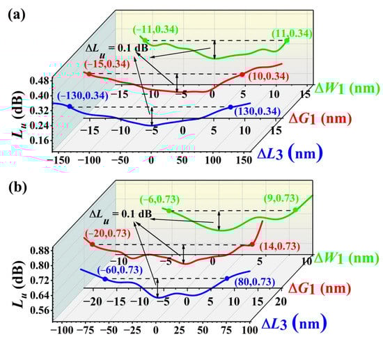 It is crucial to perform a sensitivity analysis of the device and demonstrate its robust. For the sensitivity analysis, the above constraint for parameters optimization should also be met. As shown in Figure 7, the sensitivities of 8- and 16-channel AWGs were simulated. Variations in non-uniformity were simulated by applying offsets to the AWG parameters W1, G2, and L3. For a 8-channel AWG, when ΔW1 is between −11 and 11 nm, ΔG1 is varying from −15 to 10 nm, and ΔL3 is between −130 and 130 nm, the non-uniformity lies in the range from 0.24 to 0.34 dB, as shown in Figure 7a. For a 16-channel AWG, when ΔW1 is between −6 and 9 nm, ΔG1 is varying from −20 to 14 nm, and ΔL3 is between −60 and 80 nm, the non-uniformity lies in the range from 0.63 to 0.73 dB, as shown in Figure 7b. Thus, for the 8-channel AWG, with the fabrication tolerance for W1, G2, and L3 of 22, 25, and 260 nm, respectively, the maximum variation of non-uniformity is 0.1 dB. For the 16-channel AWG, with the fabrication tolerance for W1, G2, and L3 of 15, 34, and 140 nm, respectively, the same non-uniformity change can be obtained. It should be mentioned that some phase noise would be introduced during the lithography. When the phase noise increases from 0 to 1 rad, the simulated noise floor of the 8- and 16-channel AWG would increase 4.16 and 6.14 dB, respectively. Thus, an optimized fabrication process is crucial for the device production.
