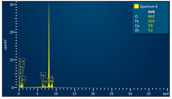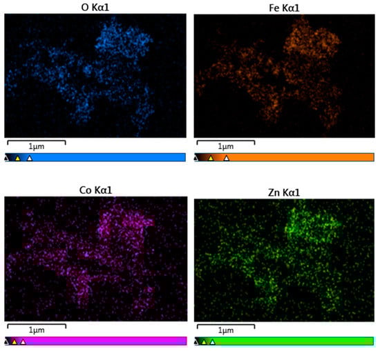 Elemental analysis by EDS confirmed the presence of Co, Fe, Zn, and O elements in all studied samples. An example of the EDS spectra for Co0.4Zn0.6Fe2O4 nanoparticles is given in Figure 3. The EDS spectra indicate that there are no other impurities present in the nanoparticles. The elemental mapping for the sample with x = 0.6 is shown in Figure 4. One can see that the Co, Zn, Fe, and O elements are almost homogeneously distributed across the selected zone of the samples investigated. Similar results were obtained for all studied samples. The elemental abundances for the studied samples are listed in Table 2. These data show that the concentrations of Zn, Co, and Fe elements in the resulting product are in a close agreement with the expected stoichiometric ratio.
