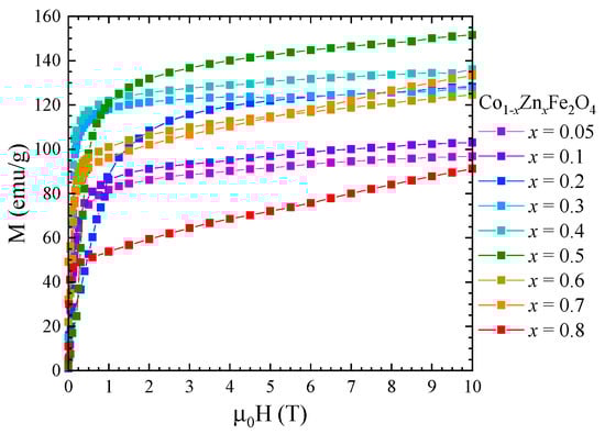 The saturation magnetization, , at 4 K of Co1−xZnxFe2O4 nanoparticles was determined from magnetic measurements in fields up to 10 T (Figure 7) using the approach to saturation law:
