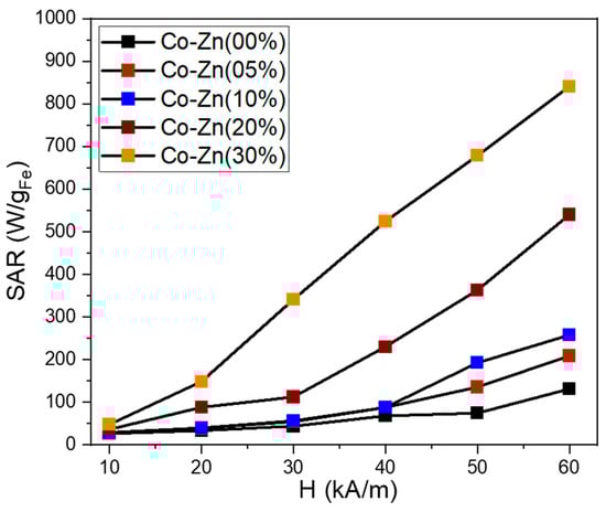 The magnetically induced heating capabilities of five samples were investigated in water at one certain concentration of 1 mgMNPs/mL. The Box–Lucas function was employed to fit the heating curves and the resulting parameters were used to evaluate the specific absorption rate (SAR) in watts per unit mass of MNPs (W/gMNPs). The SAR values were plotted as a function of the amplitude (H) of the applied AMF, ranging from 10 kA/m to 60 kA/m (step of 10 kA/m) at a fixed frequency of 355 kHz. The contribution from pure water at each H was measured and subtracted as the background. Figure 11 summarizes the obtained mean SAR values for the analyzed ferrite particles. The Co ferrites particles without Zn content present low SAR values compared with other studies [,,]. At the H of 10 kA/m the SAR is 26 W/gMNPs, which increases with the increasing H, reaching a value of 113 W/gMNPs for the highest H of 60 kA/m used in the study. A Zn doping of 5% and 10% do not significantly influence the heating performances of Co ferrite particles, specifically for H between 10 and 40 kA/m. A clear increase in SAR values with Zn doping is observed only for the H of 50 and 60 kA/m. Excepting the field H = 10 kA/m, for the rest values of H (20–60 kA/m), the SAR values increase considerably for Co ferrite bearing a Zn doping of 20%. A SAR of 88 and 112 W/gMNPs is recorded at 20 and 30 kA/m, respectively, which is double that of the previous three samples. Starting with 40 kA/m, the SAR increment is faster, going up to 540 W/gMNPs for the highest H of 60 kA/m. The SAR evolution with H is typical of a hard sample []. It is worth mentioning that, for each H value, the SAR increased as the Zn doping level was increased. This behavior can be explained by considering the similar dependence of saturation magnetization on the Zn content [].
