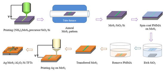 The whole process of fabricating TFT devices, including the EHD jet printing of the MoS2 semiconductor, the PMMA-based transfer of MoS2 onto Al2O3/Si, and the EHD jet printing of Ag as the S/D of the TFTs.