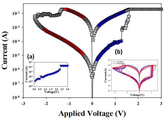 The I–V curves, initial forming process properties, and capacitor structure of the vanadium oxide thin film RRAM devices for the set and reset state are shown in Figure 3. The current compliance was 10 mA in Figure 3a. After the initial forming process at a voltage of 3 V, the vanadium oxide thin films from the RRAM devices reached the low resistance state (called LRS) and the high resistance state (called HRS). In order to find and confirm a stable (I–V) operating switching condition, the set and reset processes of the vanadium oxide thin films from the RRAM devices were repeated 100 times. The typical I–V curves of the RRAM devices are shown in Figure 3b, magnified by100 times.