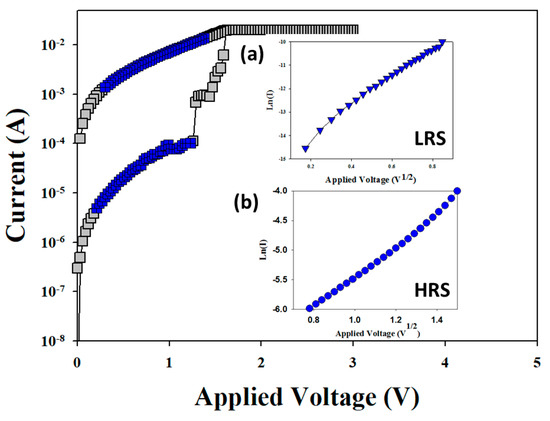 In Figure 4a,b, the electrical conduction mechanisms of the vanadium oxide thin films from the RRAM devices for LRS/HRS in set state were explained. In addition, different slope and intercept values of the straight-line equations of I–V switching curves in LRS/HRS were observed as shown in Figure 4a,b. For the LRS and HRS states, the slope value of the Schottky emission conduction in the I–V curves of the RRAM devices was calculated as 7.5 and 2.85, respectively. The reciprocal slope value was calculated for the Schottky emission distance value, and the intercept was calculated for the barrier height value of the Schottky conduction equation [13,14,15,16].