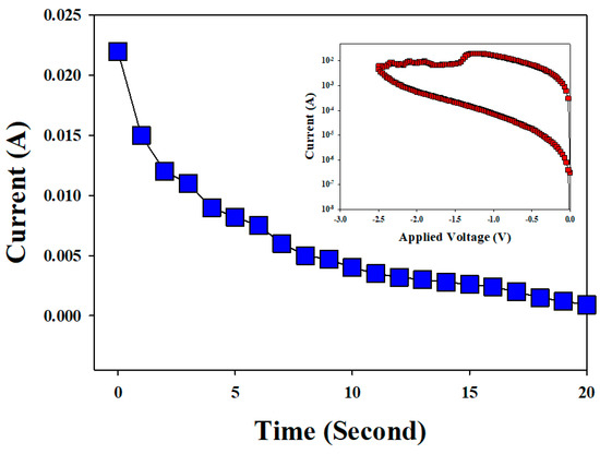 where the Q value is the instantaneous integral of the current. To effectively discuss the first order rate law for the electrochemical reaction mechanism in the reset state of the vanadium oxide thin film in the RRAM device, a CVS method was used to measure and discuss the mechanism by which a low resist state (LRS) transforms into a high resist state (HRS). Selecting a suitable negative CVS method was important to measure and confirm the resistant of the LRS state, because of its switching transition effect, long reset process time, and the heating energy effect in the reset process of the electrochemical reaction.