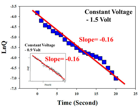 According to the equation for the linear relationship between the natural logarithm of the production concentration of reactant and reaction time, , where [A] is the reactant concentration and k is the reaction rate constant. In addition, the mole of the reactant is equal to Q/(qn), where n is the quantity of the reaction, and q is the charge of one mole electron. It means that the reactant [A] is proportional to the total charge number in the reset process. Because the volume of the thin film is not changed in the reset process, the equation [Q/(qn)]/V = mole/V = [A] was used and measured. In Figure 6, the total charge quantity variation between the charge versus reaction time (lnQ–T) relationship curves of the vanadium oxide thin film RRAM devices for constant sampling voltage in the reset state was observed. The slope of the lnQ–T curves was transformed according to the reaction rate. According to the first order reaction law of decay, the slope of the lnQ–T curves in RRAM devices for −1.2 V constant sampling voltage was calculated as −0.16. In addition, the slope of the lnQ–T curves in RRAM devices for −0.9 V was about −0.16. From the above experimental results, the reaction rate constant in this study was found and estimated to −0.16.