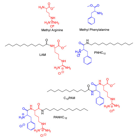 In order to improve the antimicrobial activity, new surfactants containing in the polar head both arginine and phenylalanine have recently been synthesized [3,9]. The structures and acronyms of the new surfactants are shown in Figure 1. These surfactants exhibit excellent antimicrobial, antifungal and antibiofilm activity. Notably C12PAM can be classified as readily biodegradable compound and also showed very good activity against numerous MRSA strains, nowadays, one of the most problematic bacteria [10].