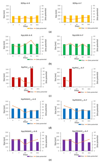 The nanoparticles stored at room temperature (25 °C) and freezer (4 °C) were characterized in terms of size, pdI and zeta potential immediately after their preparation and at pre-set times over 365 days (Figure 3 and Figure 4). During the stability evaluation, the formulations in which a substantial disruption and/or precipitation occurred were immediately removed from the assay.
