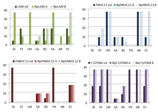 Regarding the preparation method, NpLAM-A were found more active than those prepared by method B. In contrast, NpPANHC12 and NpC12PAM presented equal activity (Figure 11 and Figure 12), despite the preparation method used. Moreover, few cases of low/lack activity of the surfactant-nanoparticles were observed.