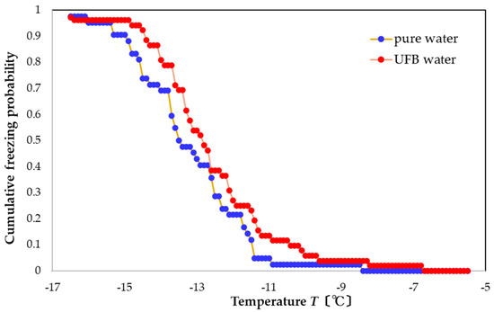 We investigated the nucleation of ice in UFB-suspended solutions. Compared to previous studies, we used a larger solution volume (1 mL) to reduce potential influences of the container wall on nucleation. The UFBs in the solution had a number density of 108 mL−1. Based on multiple measurements of nucleation (more than 50 tests) under the same temperature, we could quantify changes to the nucleation activity by examining the shift in the freezing curve (i.e., the cumulative nucleation probability distribution).