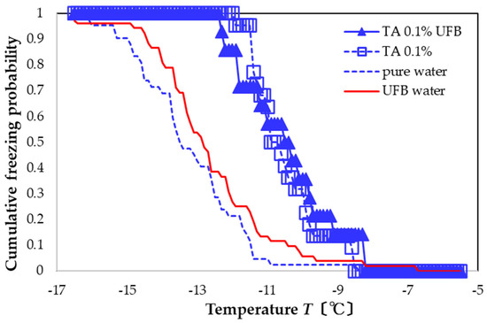 Figure 6) promotes nucleation more than that of an aqueous solution including only UFBs (red solid line). In particular, the FAC value with respect to pure water is +2.8 °C, whereas that with respect to UFB-included water is +2.2 °C. The FAC values are the same as those with only the TA 0.1 wt% aqueous solution; that is, the presence of UFB in the TA solution has almost no effect on the freezing activity.