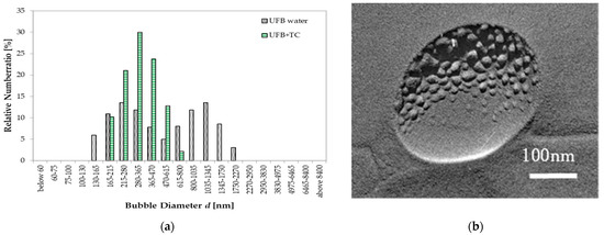 Figure 11a). As a reference, we also plotted the size distribution of small particles in 0.1 wt% OLG solution (without UFBs). These particles are considered to be aggregates of OLG, and have a peak size centered at approximately 250 nm. TEM images of the freeze-fractured replica of the UFB-included solution with OLG show that an impurity area exists around the UFB as two triangular “wing” features. An example is shown in