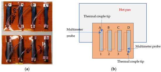 After evaluation, thin film strips with different widths and thicknesses of N-type and P-type layers were deposited on the Kapton substrate to assess their power output, as shown in Figure 2a. High-temperature conductive copper tape was used to link the strip and create connective points. One side of the strip (i.e., ABCD in Figure 2a) was put on a hot plate, which act as the heating source. The other side of the strip was left outside of the pan and cooled by naturally flowing air. Two thermal couple tips were buried under the copper tape connecting points at the hot and cold sides separately to monitor the temperature difference. One extra thermal couple tip was put on the hot pan to monitor the temperature of the heating. Two multi-meters were used to monitor the open circuit voltage/current and electrical resistance of different links such as A-1, A-4, or B-2, to assess the output of different configurations of the active layer strips. The temperature of the hot pan can be raised to 200 °C; accordingly, the tip on the active layer is about 100 °C, which can generate a temperature difference up to 80 °C. A schematic test apparatus is shown in Figure 2b.
