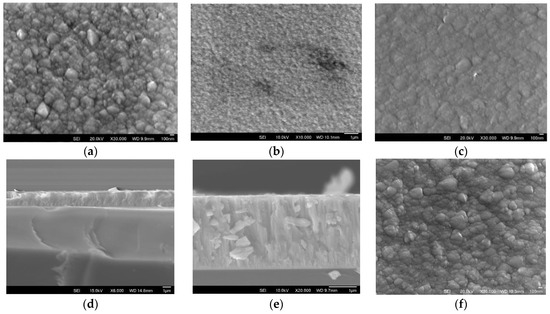 The surface morphology and cross-sectional microstructure of the P-type thin film deposited on silicon wafer with different target currents has been assessed by SEM (Figure 3). Crystallised clusters were formed on the surface after deposition, and the size only slightly changed with the increased current from 0.4 A to 0.6 A (Figure 3a–c,f). A dense fine columnar structure was formed, as seen in the cross-sectional image of P4 and P45 in Figure 3d,e. The composition of the thin film was identified by EDX, and the atomic composition ration of Bi:Sb:Te is about 2:3:4.