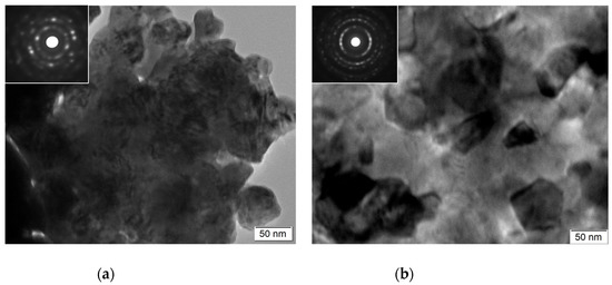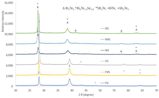 Analyzing XRD patterns taken from the N-type and P-type thin films revealed similar phase constituents for each type film, and the representatives of the patterns are shown in (Figure 5). It can be seen that the N-type thin film consists of phases of Bi2Te3 (PDF001-085-0439) and Bi6Te7.2 Se1.8 (PDF096-0151-1977), while the P-type thin film is composed of three phases: Sb2Te (PDF0001-0080-1722), BiTe (PDF0001-0089-4303, and Sb2Te3 (PDF0000-0015-0874). For the N-type thin film, the grain size (Bi2Te3 at 2θ = 27.89°) increased with the deposition current, for example, it was about 28 nm for N4 as calculated using Scherrer’s equation, while it grew to about 45 nm for N5. Similarly, for the P-type film, the crystalline size (SB2Te3 at 2θ = 28.33°) increased from about 35 nm (P4) to about 53 nm (P5). TEM observation revealed equiaxed nano-grains with dimeters of 40–70 nm, as shown in Figure 6. SAD patterns taken from both P-type and N-type thin films featured ring-patterns, characteristic of nano-structured grains. The indexing of the d-spacing values calculated from the SAD patterns confirmed the phase composition results of the XRD analysis, shown in Figure 5.