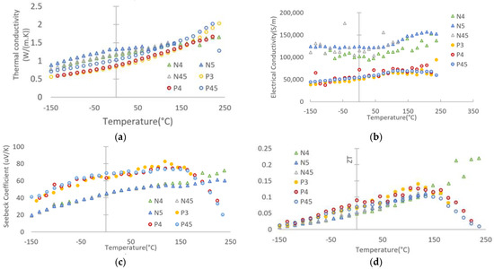 Thermal electric property measurements of the N-type and P-type thin films within the temperature range −150 °C to 230 °C: (a) thermal conductivity; (b) electrical conductivity; (c) absolute value change of Seebeck coefficient; and (d) calculated ZT value.