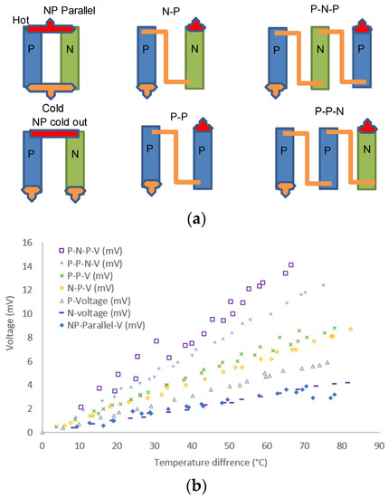 A different combination of the P-type and N-type layer (12 mm × 40 mm) on separated Kapton substrates was tested to investigate the effect of the power generation in different configurations such as P-N, P-P, N-N, PNP, PPN, etc. (Figure 9a). It was found that the hot-cold-hot-cold…series link generates most of the power; however, links such as hot side (N strip)–cold side (N strip)–cold side (P strip)–hot side (P strip) generate less power even less than one single P or N strip, as evidenced in Figure 9b.