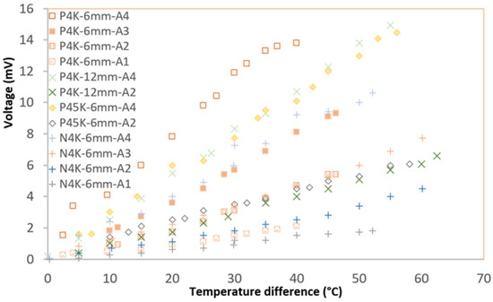 After testing different configurations of P-type and/or N-type layers, a series link of four P-type layers with different thicknesses and widths were used to assess the impact of thickness and width layer on the output of the power in the active layer (Figure 2a). Generally, when the amount of active layer was increased from one strip to four strips, the open circuit voltage increased proportionally for all of the active layers, and the same was true for the electric current output. As reported by Kwon, increasing the pair of the P-type Bi0.4Sb1.6Te3 and N-type Bi2Te3 layer grown by the metal organic vapor phase deposition can boost the power output [36]. Interestingly, the 6 mm wide and 40 mm long P-type layer (P4K-6mm) outperforms the thicker layer on Kapton for sample P45k-6 mm and a wide layer of 12 mm for P4K-12 mm in all of the strips as shown in Figure 10. In the meantime, the entire P-type layer has higher power output than the N-type layer on the Kapton substrate, i.e., N4k-6 mm.