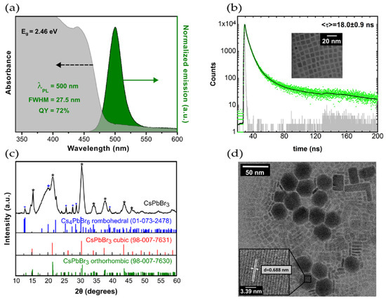 (a) Absorbance and photoluminescence emission spectra of CsPbBr3 nanocrystals in n-hexane; (b) photoluminescence decay of CsPbBr3 nanocrystals in n-hexane; (c) X-ray diffraction pattern of a drop cast from the higher concentration colloidal CsPbBr3 (pellet re-dispersed in 2.5 mL of hexane) on a quartz substrate, and the XRD reflections of cubic (ICSD ref. 98-007-7631) and orthorhombic (ICSD ref. 98-007-7630) CsPbBr3, and rhombohedral Cs4PbBr6 (ICSD ref. 01-073-2478); (d) STEM images of cesium lead perovskite nanocrystals obtained from the hot-injection synthesis showing the presence of three different phases; the inset depicts the rhombohedral 0D Cs4PbBr6 perovskite nanocrystals with clear lattice fringes and an estimated interplanar distance of 6.88 Å corresponding to the (110) plane.