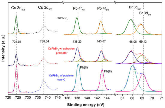 Upon incorporation of the adhesion promotor on the CsPbBr3 NCs thin film, bands appear at 69.65 eV (Br 3d3/2) and 68.64 eV (Br 3d5/2) due to corner sharing of [PbBr6]4− in CsPbBr3 [40]. As observed for the thin film of CsPbBr3 NCs encapsulated with parylene type C, the Br 3d3/2 and Br 3d5/2 peaks shift to higher binding energies, 69.12 eV and 68.08 eV, respectively. This, together with the shift towards higher binding energies of the peaks for the Pb 4f, indicates a change in the crystal structure, which may be related to the stabilization of the NCs in the form of Cs4PbBr6 [40].
