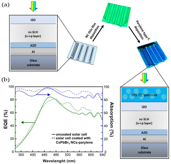 Photovoltaic cell integration: (a) layers that make up the uncoated nc-Si:H PV cells and the process of incorporation of the CsPbBr3 NCs-parylene type C thin film leading to the coated PV cell; (b) EQE (green lines) and absorption (blue lines) of the solar cell of replica ii before (solid line) and after (dashed line) the incorporation of the CsPbBr3 NCs-parylene type C thin film.