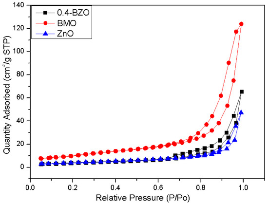 Nitrogen adsorption-desorption isotherms of BMO, ZnO, and BZO catalysts.