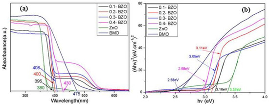 Among them, α is the absorption coefficient, h and υ are the Plananger constant and incident light frequency, respectively; A and Eg refer to the constant and the band gap energy, respectively; and n takes different values according to the type of semiconductor. For the direct transition type, n = 1, and for indirect ones, n = 4 [49,50]. Both ZnO and BMO belong to direct transition semiconductors, so n = 1 was taken [51].
