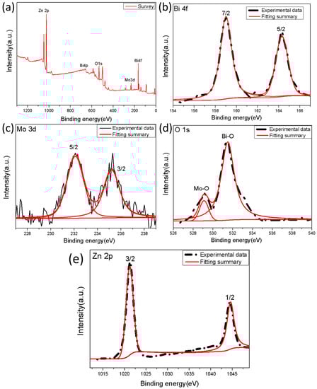 The full spectrum of the photoelectron spectrum of BZO nanoparticles was shown in Figure 8. It can be seen that the sample was composed of four types of elements: Bi, Mo, O and Zn (Figure 8a). No obvious impurity peaks were detected except for the C element which could be attributed to the reference value carried by the instrument. The positions of Bi, Mo, and O peaks were basically consistent with the positions of BZO nanoparticles reported previously [53,54], which indicated that BZO nanomaterials had been successfully synthesized. The two peaks at 159 eV and 164.1 eV in the Figure 8b correspond to Bi 4f7/2 and Bi 4f5/2, respectively [55]. The two Gaussian peaks with binding energies of 232.3 eV and 235.5 eV correspond to the electron binding energies of Mo 3d5/2 and Mo 3d3/2(Figure 8c), which were caused by the spin-orbit splitting of electrons, indicating that molybdenum in the form of Mo6+ [56]. In addition, the peak shape of O 1 s also exhibited as Gaussian distribution. The peak at 529.2 eV corresponded to the lattice energy between Mo and O, and the peak at 530 eV to the oxygen vacancies between Bi-O metal oxides (Figure 8d) [57]. The peaks associated with binding energies of Zn 2p3/2 and 2p1/2 were 1021.9 eV and 1045.1 eV respectively [58,59].