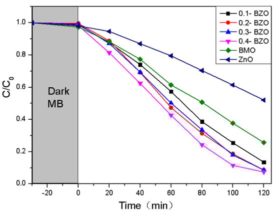The catalytic performance of the samples under visible light was evaluated with MB as the substrate. After stirring for 30 min under dark conditions, the adsorption–desorption of substrates was equilibrated for all samples (Figure 9). The photocatalytic performance of BMO, ZnO, and BZO composites was evaluated by measuring dye degradation under simulated visible light irradiation. The MB degradation rate was measured as 74%, 48%, 86.5%, 91.3%, 91.4% and 92% at 2 h for BMO, ZnO and four X-BZO complexes. When the content of BMO was increased from 20% to 40%, the catalytic efficiency was not greatly improved. Among the prepared samples, pure ZnO showed the worst photocatalytic effect compared with other samples. When BMO was put in, the dye degradation rate was sharply increased.