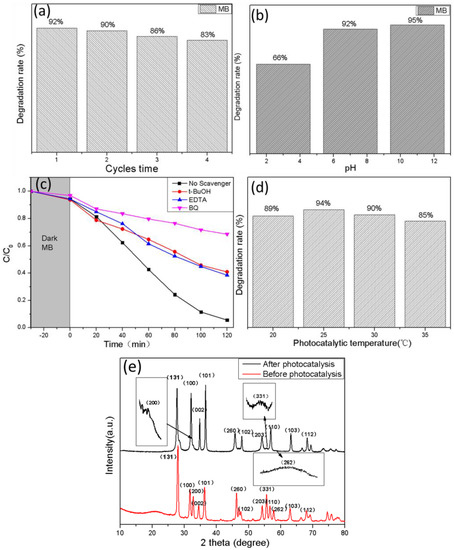 The effect of different pH values on the photodegradation of dyes has been explored, eg. photocatalytic efficiency on RhB degradation at pH 5, 7 and 11 [63], the different pH values (pH = 1,4,7,10) on the degradation of RhB [64] and the settling behavior of TiO2 at different pH values (pH = 3.60, 5.98 and 9.15) [65]. It could be found that the different pH values represented acidic, neutral, and alkaline conditions for the reaction. Consequently, the photocatalytic degradation under three conditions of pH = 3, 7, and 11 were investigated (Figure 10b). It can be seen that under neutral (pH = 7) and alkaline conditions (pH = 11), the adsorption of dyes by the catalyst were significantly better than that under acidic conditions (pH = 3). This might be caused by the increase of OH− in the reaction environment, which would lead to the increase of ·OH and had a positive effect on the photocatalytic reaction [66]. Likewise, the degradation rate of the catalyst was the worst at pH = 3. Due to the fact that the catalytic efficiency for cases pH = 7 and pH = 11 were similar, pH = 7 was selected economically as the experimental condition because of low energy cost. In order to study the main oxide species in the photocatalytic synergistic degradation of MB by BZO, EDTA, p-benzoquinone (BQ) and tert-butanol (t-BuOH) were used as scavengers to capture holes (h+), superoxide radicals (•) and hydroxyl radicals (·OH), and the degradation situation without scavenger was used as the control group [67]. All species had significant roles in the photocatalytic degradation process. Compared with other substances, p-benzoquinone played the most significant role in the degradation reaction, which indicated that superoxide radical (•) played a major role in the degradation reaction (Figure 10c). The effects of temperature on the degradation of MB were investigated at different temperatures (Figure 10d). One can easily find that the degradation rate at room temperature was the best (94%). As shown in Figure 10e, XRD patterns before and after photocatalysis were analyzed, and it was found that several peaks, such as (200), (331), and (262), widened after photocatalysis. This may be caused by the decrease of the particle size, defects, or internal stress during the photocatalytic degradation [68,69].