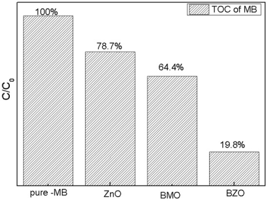 Total organic carbon (TOC) was measured to study the degradation results of BZO compared with ZnO and BMO. The results were shown in Figure 11. It was worth noting that the degradation efficiency of BZO obtained was remarkably higher than that of single ZnO or BMO, which indicated that BZO had a better degradation effect.