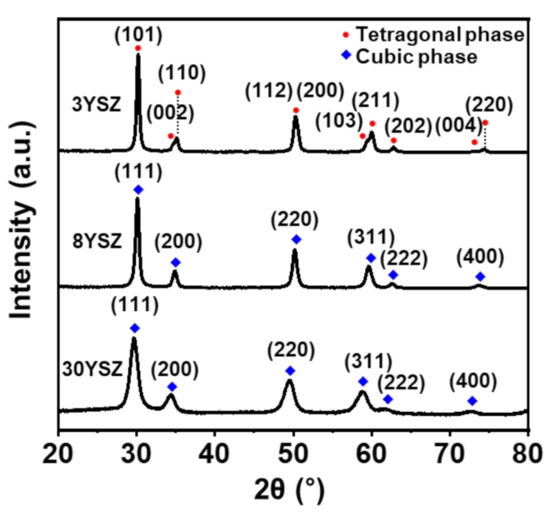 The XRD patterns of the synthesized YSZ nanospheres (Figure 3) reveal that the 3YSZ nanospheres consist of a pure tetragonal phase (JCPDS No. 48-0224), while the 8YSZ and 30YSZ nanospheres consist of the fully cubic phase (JCPDS No. 30-1468) [19,20]. Moreover, the nitrogen adsorption/desorption isotherms of all prepared YSZ nanospheres exhibit typical Type II behavior, indicating the non-porous nature of the YSZ nanospheres (Figure S2), which is consistent with their specific surface areas and total pore volumes (18 m2 g−1/0.22 cm3 g−1, 19 m2 g−1/0.22 cm3 g−1, and 7 m2 g−1/0.07 cm3 g−1 for 3YSZ, 8YSZ, and 30YSZ, respectively).