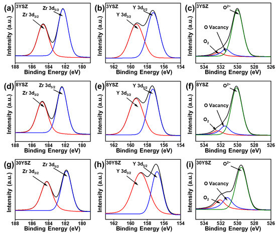 Figure 4 displays the XPS spectra of the synthesized YSZ nanospheres. The Zr 3d XPS spectra exhibit two peaks at 182.0 and 184.0 eV, corresponding to the 3d5/2 and 3d3/2 of the Zr4+ ions, respectively (Figure 4a,d,g). The Y 3d XPS spectra confirm the presence of Y3+ ions, showing two peaks at 157.3 and 159.2 eV, representing Y 3d5/2 and Y 3d3/2, respectively (Figure 4b,e,h). In addition, characteristic peaks corresponding to the lattice oxygen (metal–oxygen bond), surface oxygen vacancies, and adsorbed O2 were observed at 530.0, 531.4, and 532.3 eV, respectively, in the O 1s spectra (Figure 4c,f,i) [21]. Furthermore, the atomic compositions of the three types of nanospheres were determined to be as follows: Zr 3d = 56.54%, Y 3d = 5.32%, and O 1s = 38.14% for 3YSZ; Zr 3d = 50.65%, Y 3d = 11.54%, and O 1s = 37.81% for 8YSZ; and Zr 3d = 30.22%, Y 3d = 32.14%, and O 1s = 37.64% for 30YSZ. These correspond with the WDXRF and EDX spectra results (Table 1 and Figure S3).