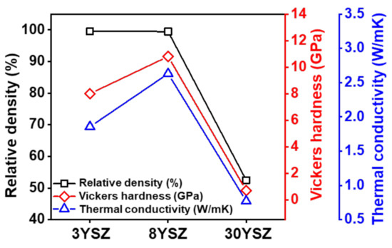 The relative density, Vickers hardness, and thermal conductivity of the sintered YSZ bodies were evaluated, as shown in Figure 7. More specifically, the 3YSZ and 8YSZ sintered bodies possessed dense structures with a relative density of ~99.5%, while the 30YSZ sintered body exhibited a porous structure with a relative density of 52.5%. The Vickers hardness values of the 3YSZ, 8YSZ, and 30YSZ sintered bodies were 8.0, 10.8, and 0.7 GPa, respectively. These results correlate with the relative densities, wherein the porous 30YSZ sintered body with the lowest relative density of 52.5% possesses the lowest hardness. Furthermore, the thermal conductivity of the 3YSZ, 8YSZ, and 30YSZ sintered bodies at 25 °C was 1.83, 2.63, and 0.77 W/mK, respectively, and it was found that the thermal conductivity was maintained even at 200 °C (Figure S5).