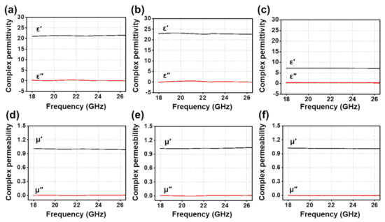 Complex permittivity of sintered (a) 3YSZ, (b) 8YSZ, and (c) 30YSZ over the K−band frequency, and complex permeability of sintered (d) 3YSZ, (e) 8YSZ, and (f) 30YSZ over the K−band frequency.