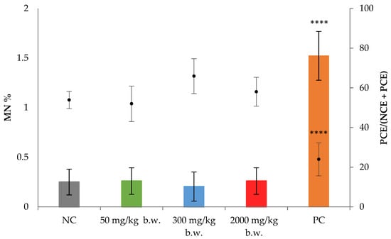 The induction of chromosomal aberrations was assessed by the MN test, in bone marrow samples, obtained from the female rats of the principal groups of the 28-day oral toxicity study, following the principles of the OECD TG 474 (Figure 1) [39]. The ratio of PCE/NCE was determined by counting 500 PCE + NCE. The total MN were determined by counting at least 4000 PCE; then the MN% was determined.