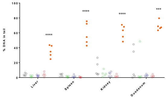 The presence of SBs or ALS was assessed by the standard comet assay in fresh liver, kidney, spleen and duodenum samples, of the female rats of the principal groups of the 28-day oral toxicity study, following the principles of the OECD TG 489 (Figure 2) [40].