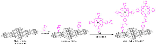 Firstly, MoSe2 and WSe2 were prepared by a one-pot reaction in an autoclave [32]. Heating of molybdenum hexacarbonyl (Mo(CO)6) (tungsten hexacarbonyl (W(CO)6) alternatively) and Se powder in p-xylene produced grams of 1T-MoSe2 (and 1T-WSe2, respectively). Afterward, sonication (ca. 1 min.) of the aqueous dispersion of TMDs and aminopyridine yielded amino terminated groups to the transition metal diselenides, via the formation of a metal-ligand bond between Mo or W and the pyridinic nitrogen, furnishing functionalized MoSe2 (f-MoSe2) and WSe2 (f-WSe2), respectively. Next, a condensation reaction between amino-modified transition metal diselenides and carbonyl-terminated CoP led to the formation of MoSe2-CoP and WSe2-CoP, as seen in Figure 1.