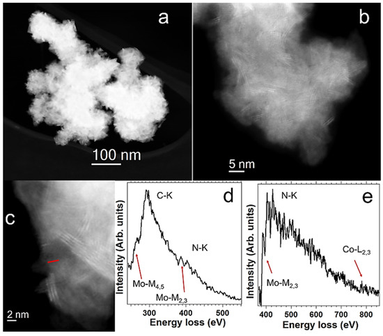 The morphology, structure, and chemical composition of these hybrids were analyzed via scanning transmission electron microscopy (STEM). Figure 2a shows that flakes of around one micron were obtained. They are similar to the ones of the starting MoSe2 material (Figure S1). High-resolution high-angle annular dark field (HAADF) STEM images of these flakes of MoSe2-CoP show that the TMD material corresponds to the 1T phase (Figure 2b,c). Similar STEM-HAADF imaging analyses were also performed on WSe2-CoP (Figure S2). Electron energy-loss spectroscopy (EELS) in the spectrum-line model [33,34] was employed to locally investigate the chemical nature of these nanostructures and in particular to identify the CoP moieties. An EELS spectrum-line was recorded in the highlighted area of Figure 2c. From this EELS spectrum-line, 15 EEL spectra, recorded in the red-marked line of Figure 2c, were selected and added. Two different energy regions of the EEL spectra are displayed in Figure 2d,e. The detection of C, N, and Co in this area confirms the presence of the CoP entities at the surface of MoSe2.