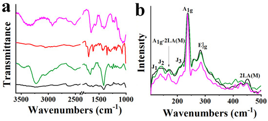 (a) ATR-IR and (b) Raman spectra (514 nm) for MoSe2-CoP (pink), MoSe2 (black), f-MoSe2 (green), and CoP (red).