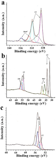 Insight into the MoSe2 and WSe2 phases was given from X-ray photoelectron spectroscopy (XPS) measurements. Figure 4a depicts the deconvoluted Mo 3d spectra, showing doublets at 228.6 eV for Mo 3d5/2 and 231.8 eV for Mo 3d3/2, revealing the existence of the 1T phase in MoSe2. The doublet at higher energies, 232.9 eV for 3d5/2 and 235.7 for 3d3/2, corresponds to Mo6+ [39,40]. Similarly, deconvoluted W 4f spectra are shown in Figure 4b. The apparent doublet of the 4f W+4 peaks at 31.7 for W4+ 4f7/2 and 33.9 eV for W4+ 4f5/2 is assigned to the 1T phase, while signals at 36.04 and 38.22 eV indicate the presence of W6+ species within WSe2 [40,41]. The Se 3d peak profile of MoSe2 can be fitted into two sets of doublet peaks at higher energies (55.0 eV for Se 3d3/2 and 54.2 eV for Se 3d5/2) for the 2H phase and another couple at lower energies (54.4 eV for Se 3d3/2 and 53.6 eV for Se 3d5/2) for the 1T phase (Figure 4c) [39,40]. The same applies to the Se 3d peak profile of WSe2; peaks at 55.3 eV for Se 3d3/2 and 56.1 eV for Se 3d5/2 for the 2H phase and 54.7 eV for Se 3d3/2 and 53.7 eV for Se 3d5/2 for the 1T phase (Figure 4a) [40,41]. The above results are aligned with the Raman data suggesting the strong presence of the 1T phase in MoSe2 and WSe2.